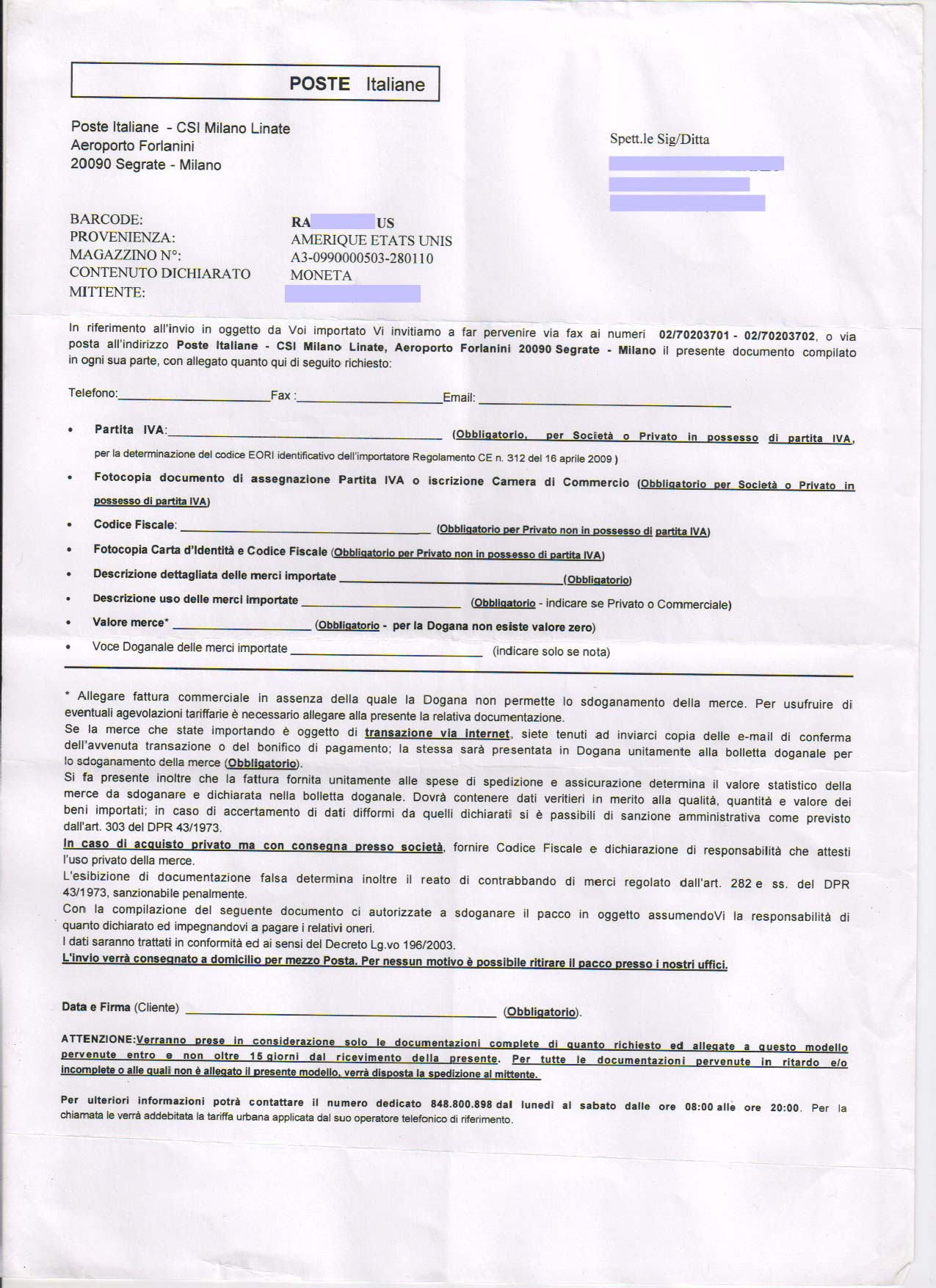 Quando comprate potete scegliere la spedizione ordinaria che e utile perchè non tracciata ma poi vi rubano le monete quindi meglio desistere, comunque le spedizioni non tracciate pare passino da Linate dove subiscono controlli a campione e arrivano fra i 10 e i 20 giorni. Le lettere e pacchi raccomandate invece dovrebbero andare a Malpensa, ossia alla dogana di Milani Linate Pozzoli, che statisticamente sembra pi? severa, tre settimane sono normali salvo che scatti l"ispezione al che si superano i quattrro mesi.